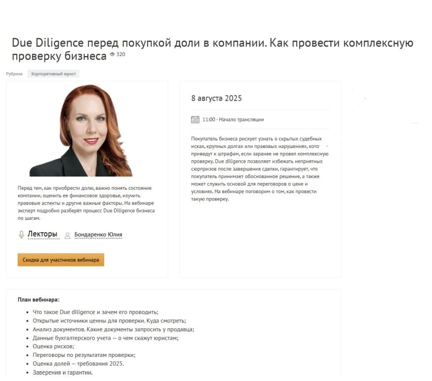 8 августа проведу вебинар на тему: Due Diligence перед покупкой доли в компании. Как провести комплексную проверку бизнеса. Записаться на вебинар можно по ссылке https://event.law.ru/seminar/934-due-diligence-pered-pokupkoy-doli-v-kompanii-kak-provesti-kompleksnuyu-proverku-biznesa