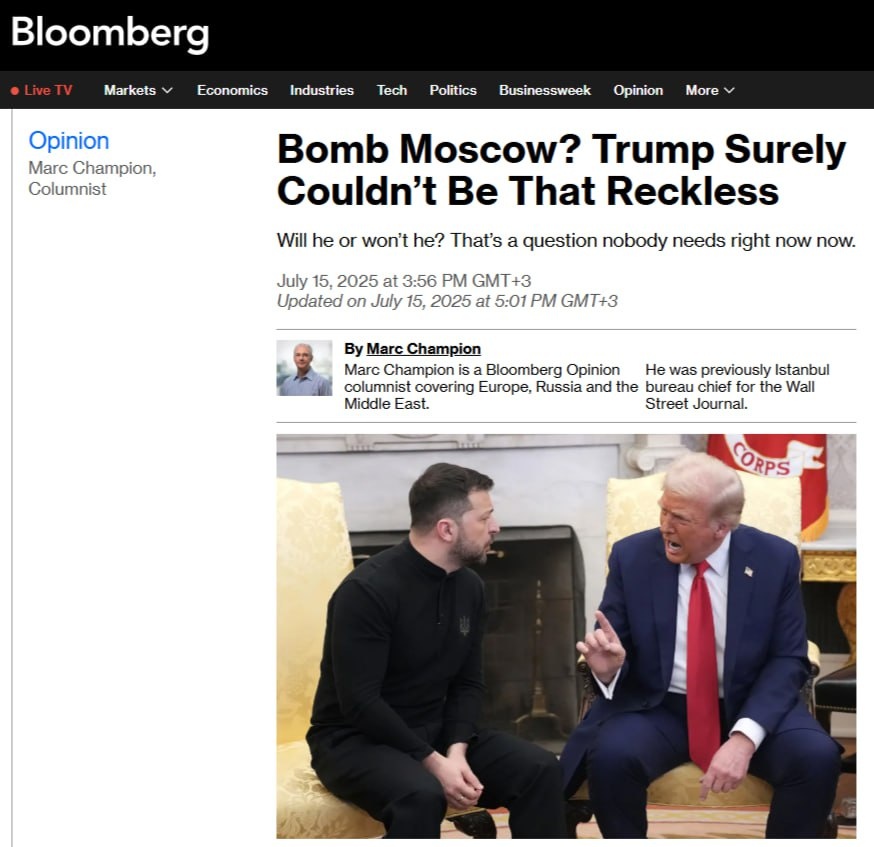 Новости хорошие: никто дяде Трампу не поверил 👍 Ну что, дорогие подписчики? Просматривал я сегодня западную прессу в поисках интересной статьи, но всё проходное. Никто Трампу не поверил. Единственная приличная статья - на Bloomberg 🤨 Бомбить Москву? Трамп наверняка не настолько безрассуден. Сделает он это или нет? Сейчас этот вопрос никому не нужен. Дональду Трампу многое не удалось сделать для того, чтобы заставить Россию начать настоящие мирные переговоры по Украине. Но теперь сообщается, что он спросил президента Владимира Зеленского, может ли тот сделать то, что никому в здравом уме и не придёт в голову предложить: разбомбить Москву, столицу параноидальной ядерной сверхдержавы, с помощью американских ракет большой дальности. Белый дом заявляет, что Трамп «просто задал вопрос, а не призывал к дальнейшим убийствам». Я предполагаю, что заявление Трампа об угрозах в адрес Москвы, сделанное во время предвыборной кампании и записанное CNN, было лишь одной из бесчисленных ложных за