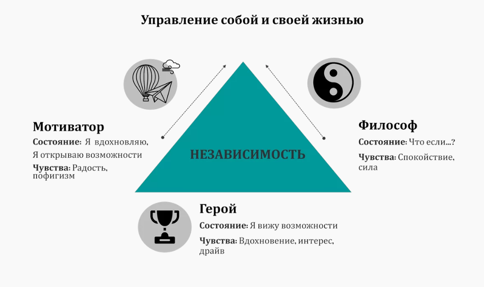 Этот аспект личности очень подвижен и любопытен: он постоянно сканирует окружающий мир в поисках новых идей и вызовов. В отличие от "токсичного" треугольника (где Жертва практически беззащитна), здесь у Героя есть свобода выбора: он может отказаться от предложений Мотиватора или тщательно их обдумать перед действием. Такой подход помогает избегать импульсивных ошибок и способствует постепенному развитию.