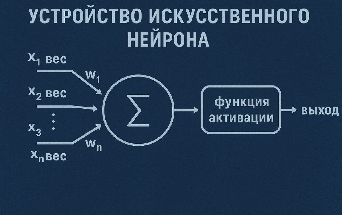 Если нейросеть сравнивают с мозгом, то её «клетка» — это искусственный нейрон. Понять, как он работает — значит понять, на чём строится вся современная технология ИИ. И хотя слово «нейрон» звучит сложно, на деле всё куда проще. Разберёмся за 5 минут. 🔹 Что такое искусственный нейрон? Искусственный нейрон — это математическая модель, вдохновлённая тем, как работают нейроны в мозге. Он принимает данные, обрабатывает их и передаёт результат дальше. Каждая нейросеть состоит из тысяч или миллионов таких нейронов, объединённых в слои. Но в основе — один простой элемент. 🔹 Как устроен нейрон внутри? У него есть три ключевых части: 1. Входы — данные, которые нейрон получает (например, цифры, пиксели, слова и т.д.) 2. Веса — числовые коэффициенты, показывающие, насколько важен каждый вход. Эти значения нейрон сам «подбирает» во время обучения. 3. Активация — результат работы нейрона. Он складывает входы, умноженные на веса, и применяет *функцию активации*, чтобы решить, передавать ли сигнал