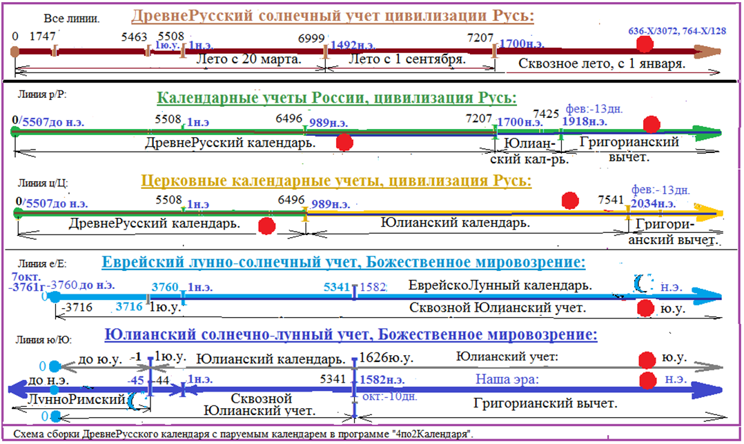 - Русская линия (разрыва с прошлым): – до 1918 года закреплен Юлианский календарь, после – Григорианский вычет с удалением 13 дней в феврале. До 1700 года был ДревнеРусский календарь. От него и от Руси в 7207 лета Петр1 отказался, принял пришлый календарь с лунной неделей. Это 1-й отказ от Руси!