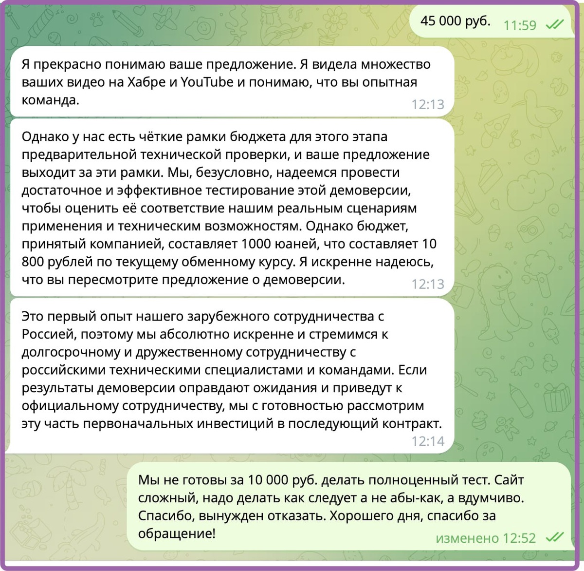Вот изнанка бизнеса - отказался от парсинга (точнее теста). Заказчик из Китая. Парсить очень сложный сайт одной авиа-компании с безумной скоростью. Написали заявку в xmldatafeed.com и я попросил 45 000 р. аванса для проведение теста (дальше эти деньги учитываются в общей работе). Что такое тест? Настроили базово, включили и наблюдаем за результатами. Если все ок - 45 000 р. дальше учитываем и продолжаем работу, если нет - заказчик теряет деньги, получает опыт. Нам же предложили тест за 10 000 р. Я отказался. Знаю из опыта - там возни на 2 недели минимум. Совсем ведь не успешный успех, да? :) Ну ладно, лучше так, чем потом кусать логти, что недооценили... p.s. вообще зачастую, после того как недоговорились, заказчики берут паузу и возвращаются, т.к. иногда их удивляет твоя неготовность кидаться на любую сумму, лишь бы взять заказ на "авось получится" :) p.p.s а еще удивился, что статьи и т.п. работают на МИР ... что прикольно Русский ИТ бизнес