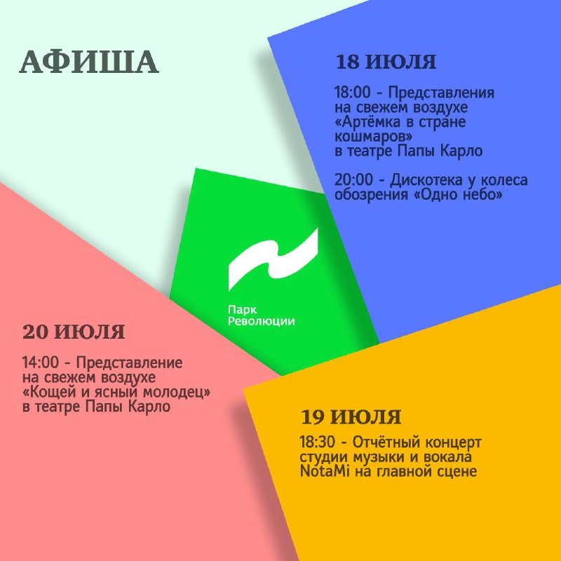 📌18 июля 18:00 - Представления на свежем воздухе «Артёмка в стране кошмаров» в театре Папы Карло 20:00 - Дискотека у колеса обозрения «Одно небо» 📌19 июля 18:30 - Отчётный концерт студии музыки и вокала NotaMi на главной сцене 📌20 июля 14:00 - Представление на свежем воздухе «Кощей и ясный молодец» в театре Папы Карло Парк Революции 📍Адрес: пл. Театральная 3 🫠 Детские мероприятия Ростов-на-Дону. Я местный!