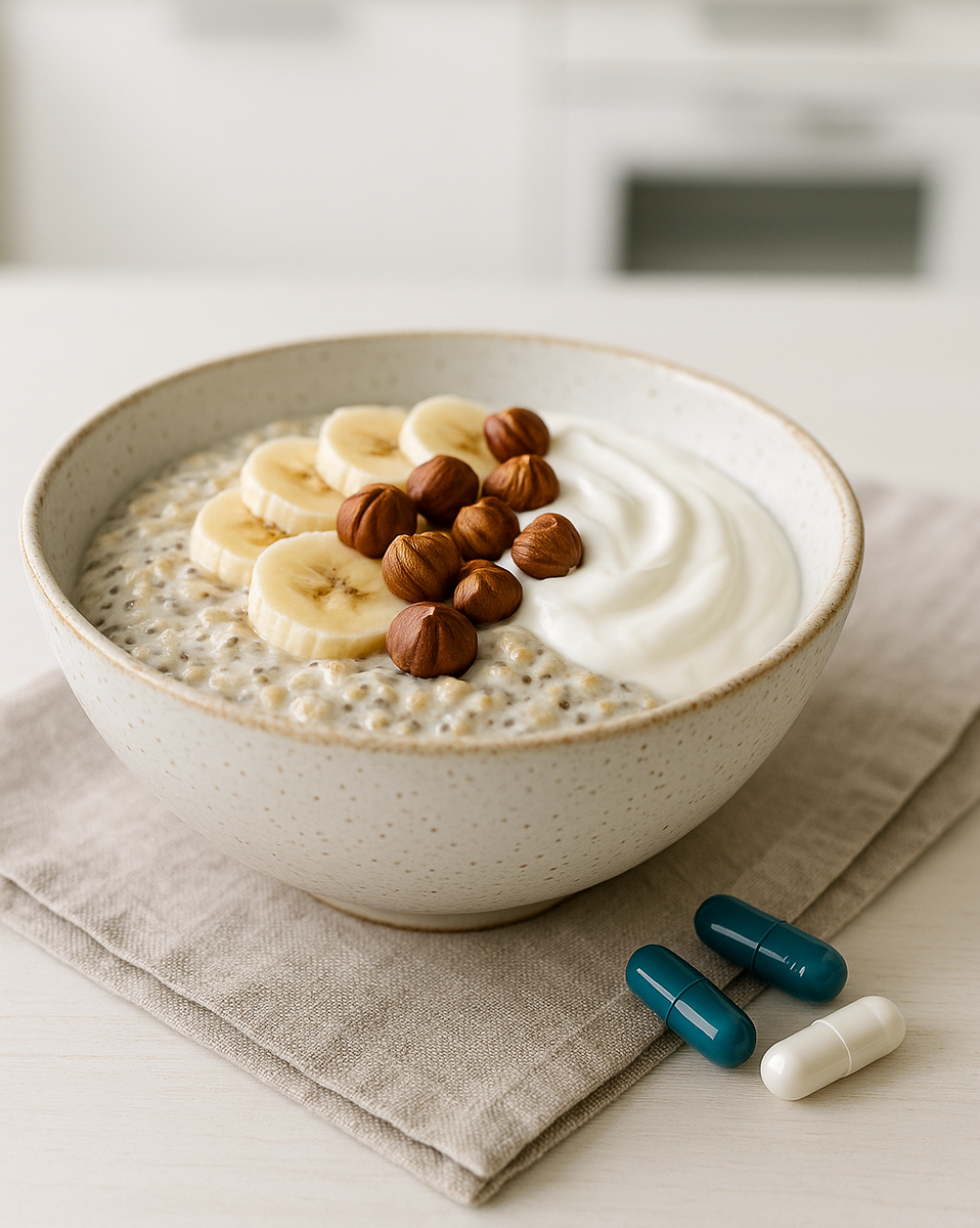 Держит сытость до обеда за счёт «тройки» — медленные углеводы, белок, полезные жиры. Что нужно (1 порция) Как сделать (5 минут) Итого ≈ 18 г белка, 8 г клетчатки — голод не вернётся до полудня. Капсула «в довесок» — мультиколлаген + 500 мг витамина C