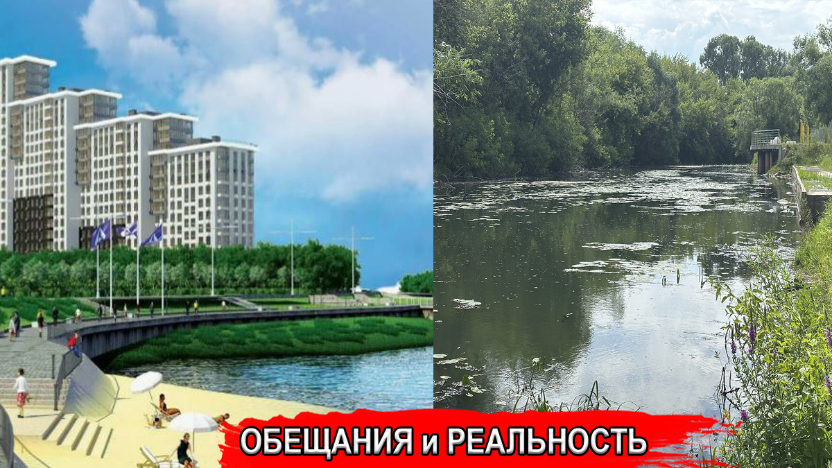 А Вы хотели жить в красивой новостройке комфорт-класса, с видом на реку или озеро, с собственным пляжем? Я бы хотел. Наверняка, хотели этого и жители шикарного ЖК "Метропарк" в Рязани. Плакаты были весьма увлекательными и заманчивыми Жители этого комплекса могли оказаться в городе мечты, где есть всё для комфортной жизни. Но, пока получается немного не так, как изначально планировалось. На месте шикарной набережной - грязноватая речушка Да, на побережье стоит небольшой детский комплекс в виде парусника, и даже дорожки красивые выложены. Но вот на пляж это как то не очень походит Речка безнадежно цветет, вода грязная, а не как на первом фото. Песочка нет. Правда, в мусорной мутной воде плавают рыбки, которых можно попробовать поймать на удочку. Но, во вкусовых качествах и полезности этой рыбы я немного сомневаюсь. Еще, здесь есть симпатичный мостик Точнее, он здесь должен был быть симпатичным. А пока есть то, что есть. Вот такие вот бетонные штуковины позволяют переходить речку на другу