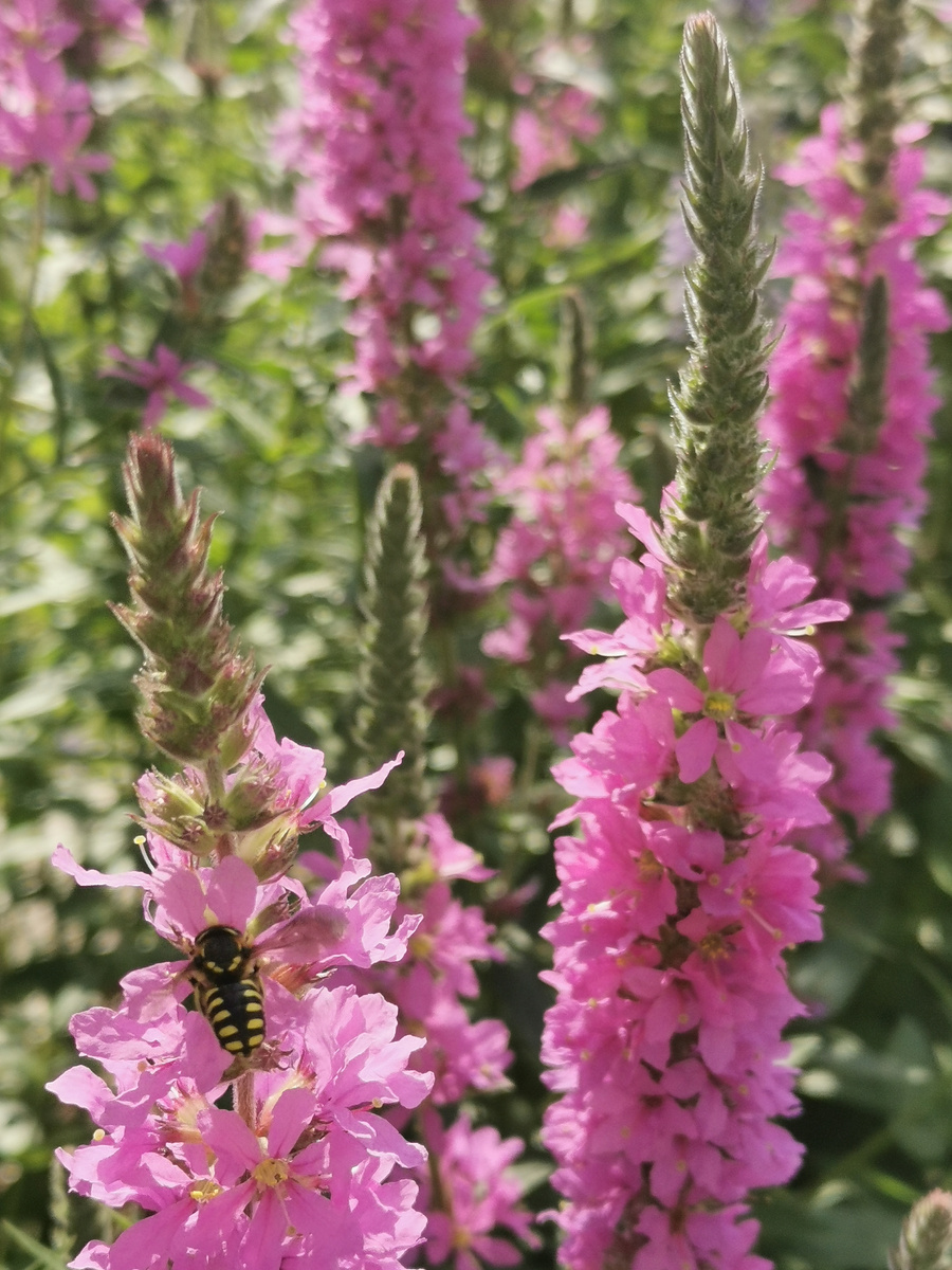 Сад наполняется растениями и привлекает все больше новых насекомых. Про пчел-осмий мы с вами уже многое знаем: А вот еще неожиданно появилась интересная пчёлка: Видели такую? Этот полосатик тоже из одиночных пчел - Пчела-Шерстобит. Кажется даже Шерстобит флорентийский, самый крупный в Московском регионе. Действительно, внушительных размеров насекомое, 1,5-2 см, мощное, летает довольно шумно, ненадолго зависая перед цветками, а потом быстро перемещается в следующую точку: Приглянулся ей только дербенник. Если бы носилась по всему саду - не угнаться вообще. Но все равно я минут 10 лазила вдоль забора, пытаясь поймать ее в кадр, но фокус все равно не успевал) Условных 3 пленки извела впустую Шерстобит откладывает яйца в полостях, снабжая каждое яйцо питанием из пыльцы. Но в отличие от осмии еще выстилает гнездо слоем пуха, который соскабливает челюстями с опушенных растений. Отсюда пчела и берет свое русскоязычное название. Стахис бы им понравился, как раз под дербенником растет! А мож