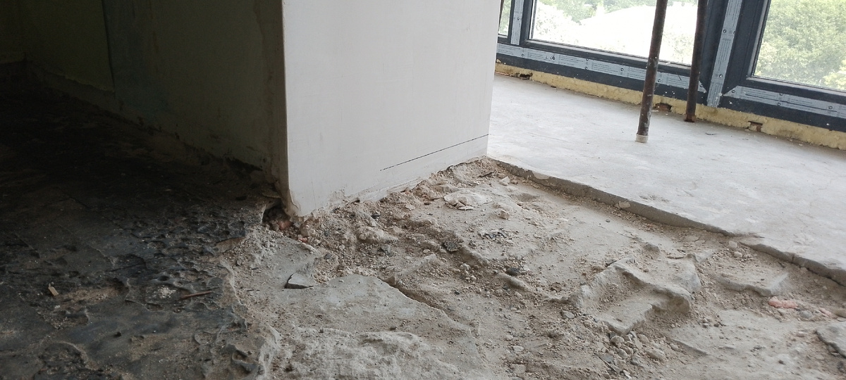 Всем привет с места ремонта! Продолжаем начатое. После финишной шпаклевки откоса и лоджии пришло время взяться за пол. Заказчиком перед нами поставлена цель вывести пол всех помещений в квартире в одну плоскость, в том числе и пол лоджии. Хотя уровень пола на лоджии оказался самым заниженным, это не стало большой проблемой, поскольку его планировалось утеплять. А значит, можно было спокойно работать с утеплителем, подбирая нужную его толщину. К вопросу утепления пола лоджии и его стяжки вернусь в следующий раз, а пока скажу, что помимо перепада по уровню пришлось решать еще одну проблему, которая вскрылась после снятия паркета в комнате. И это смола, на которую был приклеен паркет. Скажу честно, смола редко так хорошо держится на полу, как в этом месте. Всё бы ничего, если бы не теплый пол в перспективе по всей комнате. А мостырить его на смолу, даже покрытую слоем стяжки, дело сомнительное. Решение было однозначным: перед стяжкой пола по маякам смолу надо сбивать. На это у нас с н