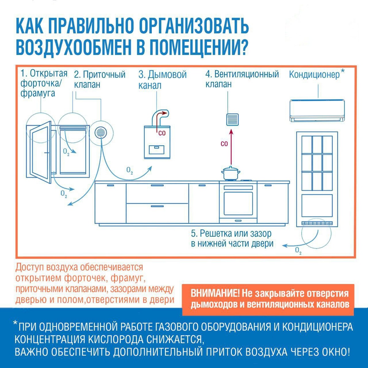 Как правильно организовать воздухообмен в помещении с газовым оборудованием ❓ ✔️Классическое правило «ВКЛЮЧИЛ ГАЗ — ОТКРОЙ ОКНО» обеспечивает надежный приток воздуха в помещение, а значит - безопасное использование газовой техники. Это самое простое решение для кухонь с газовыми котлами и плитами. ✔️Другой способ организовать хороший приток кислорода — установка приточных вентиляционных клапанов. Они бывают оконные и стеновые. Первые размещаются в верхней части окна. Вторые выводятся через стену. ✔️ Доступ воздуха осуществляется и через строительные конструкции: оконные и дверные проемы, решетки или зазоры в нижней части двери. ✔️ При одновременной работе газового оборудования и кондиционера, концентрация кислорода снижается, поэтому важно обеспечить приток воздуха через окно❗️ ✔️ Все помещения, в которых работает газовая техника, должны быть оснащены вытяжным вентиляционным каналом. Наглядно – в нашей инфокарточке 🔼 #безопасный_газ