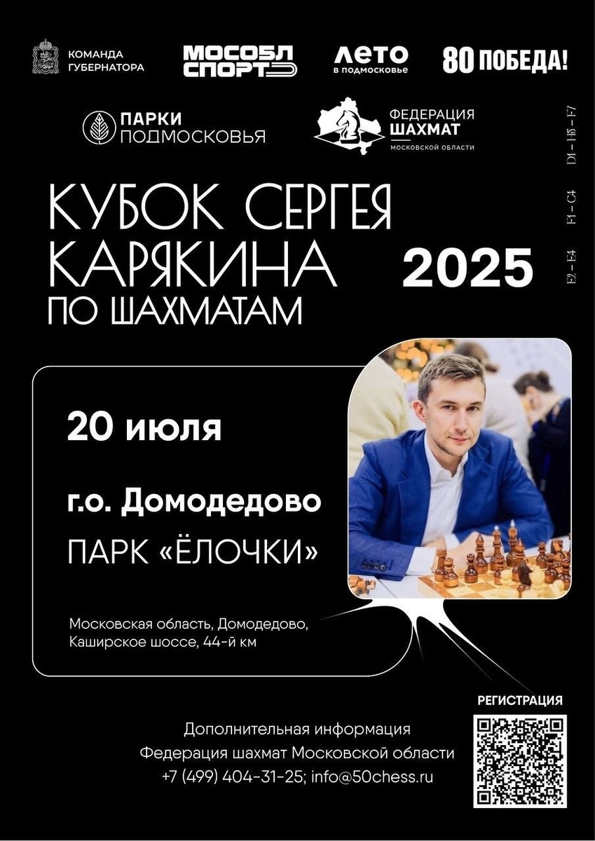 ✨ НОВОСТИ! Второй этап Кубка Карякина по шахматам пройдет в Домодедове 20 июля 📍 Мероприятие состоится в парке «Елочки», где соберутся игроки всех возрастов и уровней подготовки. Турнир приурочен к Международному дню шахмат. ➡ В программе – 5 отдельных турниров – от открытого соревнования для всех желающих до специальных групп для самых юных шахматистов (2017 г.р. и младше). ⏱ Шахматные поединки пройдут в 7 туров: по 10 минут на партию с добавлением 5 секунд на каждый ход, начиная с первого. ♟ По традиции гроссмейстер Сергей Карякин проведет сеанс одновременной игры с молодыми шахматистами. Расписание: 10:00 – 11:00 – очная регистрация; 11:00 – 11:30 – торжественное открытие; 11:30 – 17:00 – проведение 1-7 туров; 17:00 – 17:30 – церемония награждения; 17:30 – 19:00 – автограф-сессия. ✅ Мероприятия Домодедово https://dzen.ru/id/66f10385cc4c5a16f7b5fb02 http://vk.com/domodedovo_events http://dzen.ru/domodedovo_events