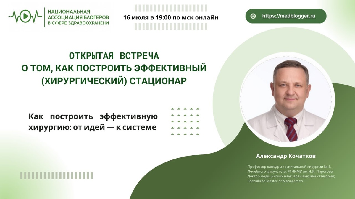 📣 Коллеги, уже завтра новая открытая встреча БЛОГЗДРАВа 🗓 16 июля (в среду) 🕖 19:00 по мск 📍 Открытое онлайн-мероприятие, но по регистрации 🎙 Спикер: Кочатков Александр Владимирович 💚доктор медицинских наук; 💚профессор кафедры госпитальной хирургии №1 РГНИМУ им. Н.И. Пирогова; 💚врач высшей категории, практикующий хирург; 💚магистр управления в здравоохранении (MHA); 💚эксперт по организации работы стационаров, управлению осложнениями и сокращению затрат; 💚практик, внедривший в России технологии ERAS/ERBS, ICG и системы контроля качества в хирургии. О чём поговорим: 📎как на практике построить хирургический стационар, который работает эффективно и безопасно; 📎что такое "врачацентричный менеджмент" и почему он нужен; 📎какие решения сокращают осложнения, упрощают логистику и повышают удовлетворённость пациентов; 📎и главное: как быть врачом, который понимает не только «что делать», но и «как управлять». Полезно для: 💚 руководителей и владельцев клиник; 💚 практикующих хи