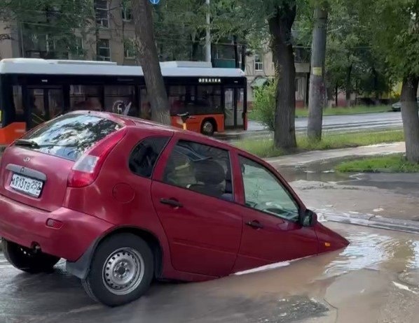 В Нижнем Новгороде автомобиль провалился в огромную лужу. Это произошло из-за коммунальной аварии: