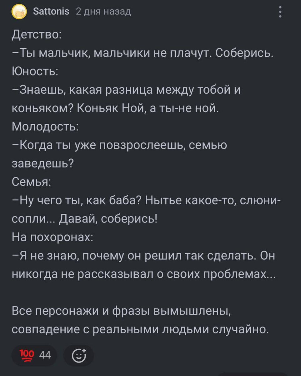 На днях прочитал на одном популярном интернет-ресурсе пост на тему «Почему мужчины скрывают свои чувства и не делятся своими переживаниями». Комментарии ужаснули. Большинство мужчин действительно считают, что никому нет дела до их внутренних проблем. Они не могут открыться своим близким и своим женщинам, поэтому, что считают это непозволительной слабостью и излишеством. Они не верят в психологов и медленно разочаровываются в себе и своей жизни. А потом молча уходят из жизни.
