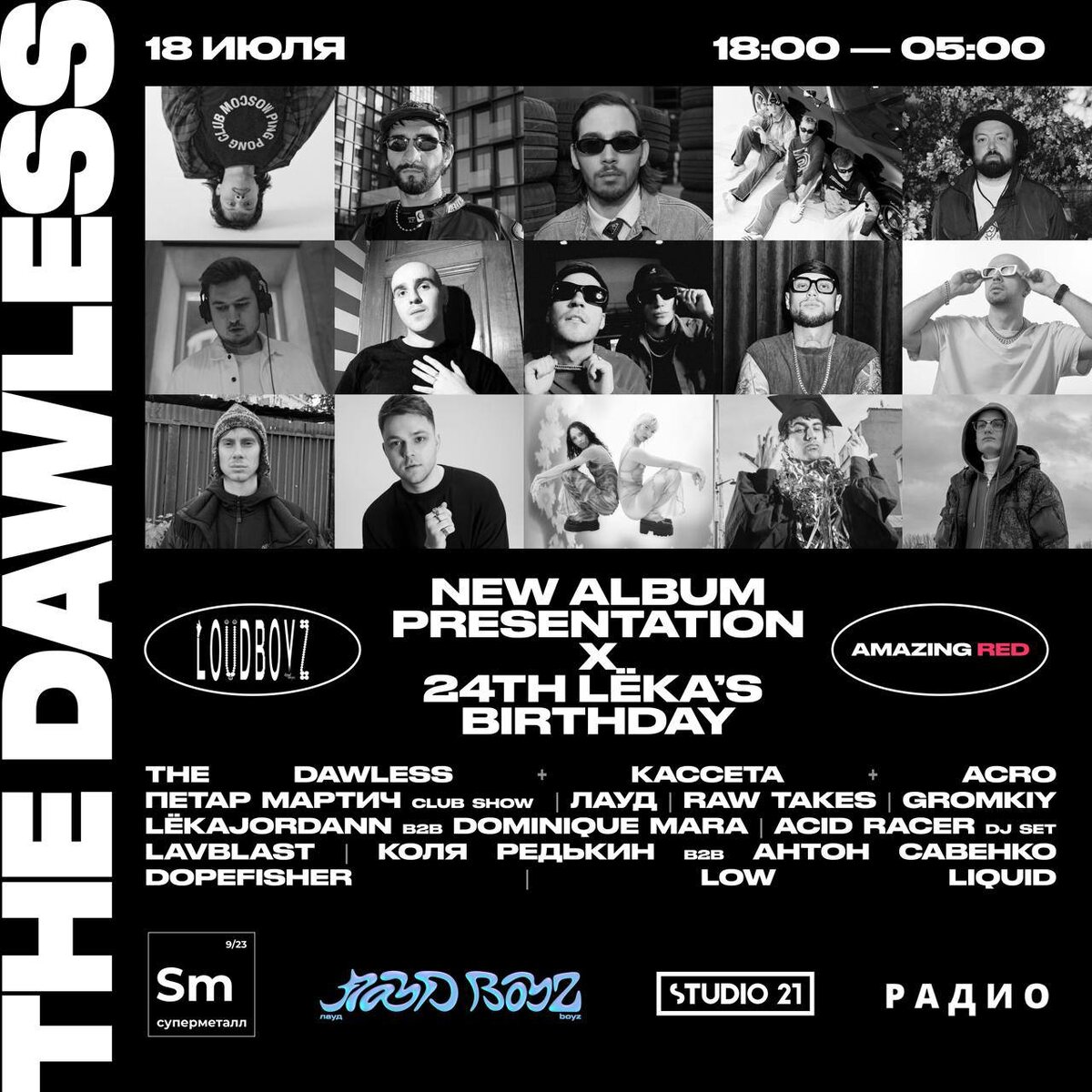 LOUD BOYZ Х THE DAWLESS NEW ALBUM X LËKAJORDANN BIRTHDAY Поводов пригнать на новую тусу LOUDBOYZ куча: презентация нового альбома THE DAWLESS, День Рождения менеджера всея Руси Лёки Иорданяна, много крутых гостей в лайнапе, двор Суперметалла, лето!!! THE DAWLESS ЛАУД КАССЕТА ПЕТАР МАРТИЧ LAVBLAST ACRO RAW TAKES GROMKIY LËKAJORDANN B2B DOMINIQUE MARA ACID RACER (DJ SET) КОЛЯ РЕДЬКИН B2B АНТОН САВЕНКО DOPEFISHER LOW LIQUID 🎫 Билеты 📆 18 июля, 18:00-05:00 📍Суперметалл, Москва, 2-я Бауманская 9/23 стр. 3