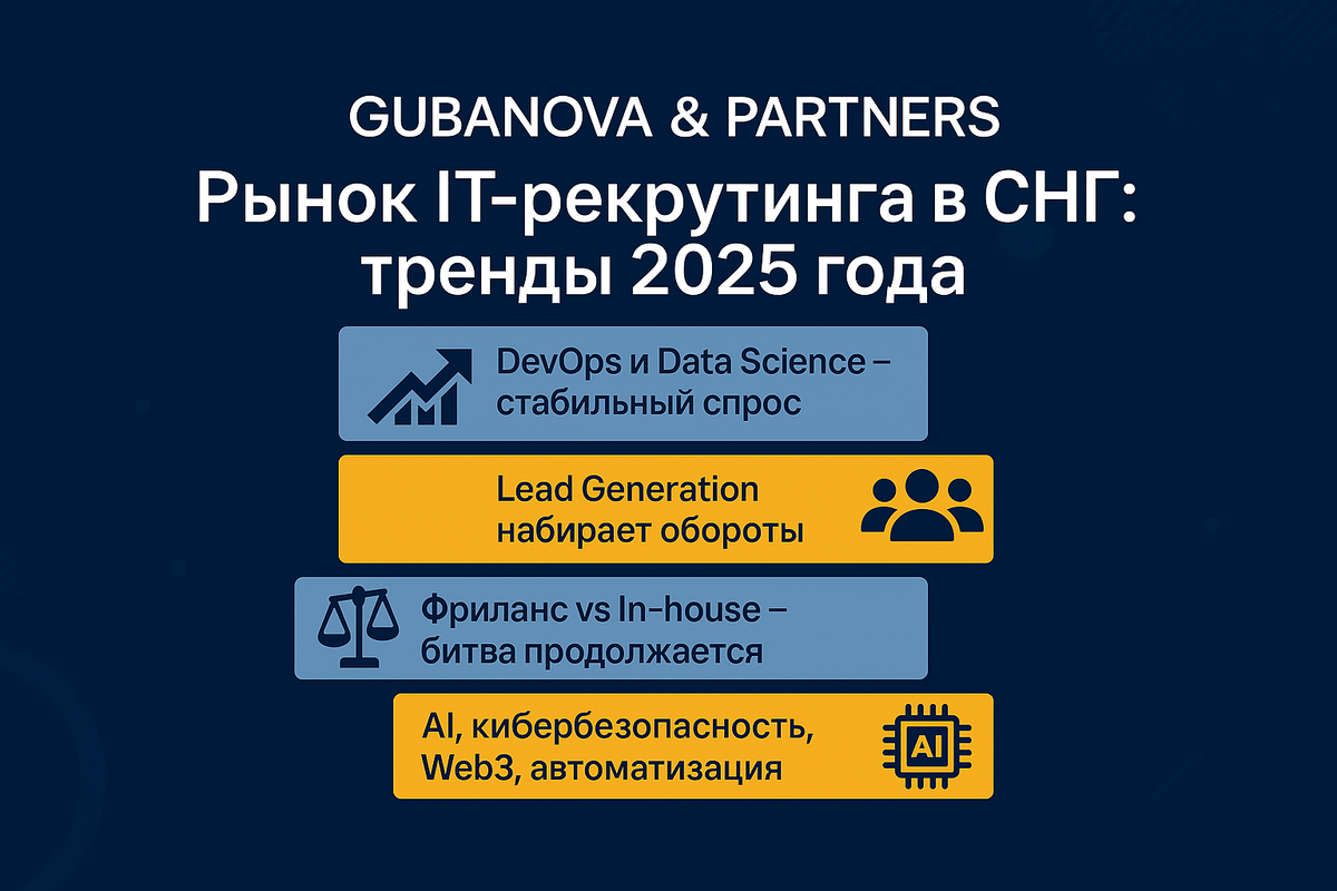 Рынок IT-рекрутинга в странах СНГ в 2025 году – это не просто эволюция, это настоящая трансформация, обусловленная стремительным развитием технологий и меняющимися потребностями бизнеса. В «Gubanova&Partners» мы внимательно следим за этими тенденциями, чтобы предоставить нашим клиентам самые актуальные и эффективные решения в области поиска и подбора IT-специалистов. Давайте взглянем на ключевые тренды, определяющие ландшафт IT-рекрутинга в этом году: 1. Стабильно высокий спрос на DevOps и Data Science: • DevOps: Компании продолжают активно внедрять методологии DevOps для повышения эффективности разработки, развертывания и эксплуатации программного обеспечения. Это порождает постоянную потребность в квалифицированных DevOps-инженерах, владеющих навыками автоматизации, контейнеризации, облачных технологий и CI/CD. Мы видим, что наиболее востребованы специалисты, имеющие опыт работы с Kubernetes, Docker, AWS, Azure и другими передовыми инструментами. • Data Science: В эпоху больших данны
