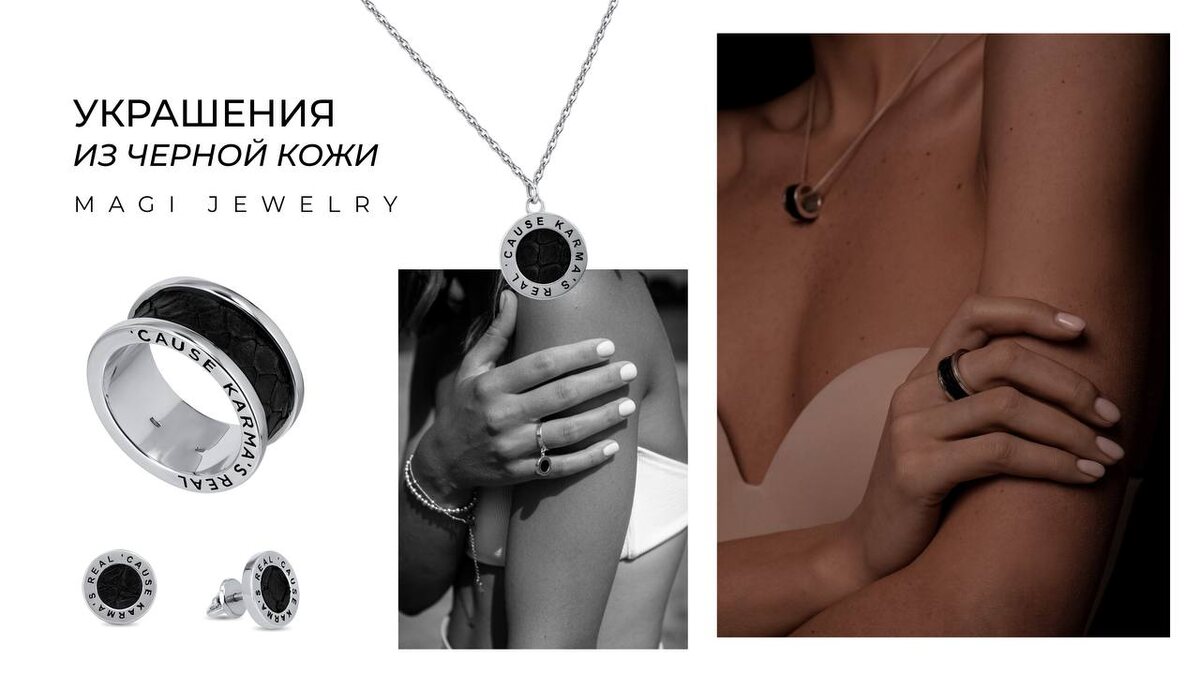 В нашей коллекции представлены изделия из черной и бежевой кожи питона. Это серьги пусеты, кольца двух видов и подвески