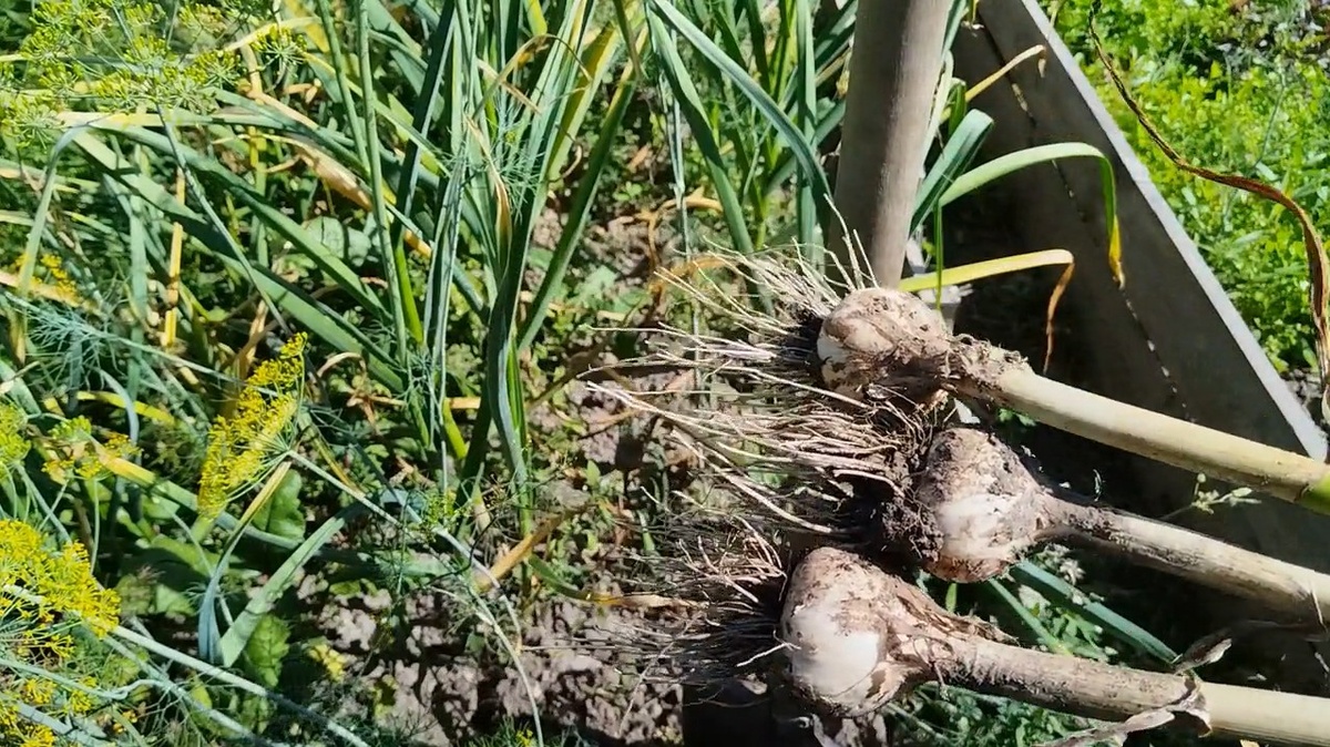 Признаки зрелости чеснока: 1. **Пожелтение листьев**. Сначала желтеют нижние два-три листа, затем этот процесс захватывает верхние. 2. **Семенная коробочка**. У зрелого растения цветонос выпрямляется, коробочка трескается, обнажая фиолетовые семена-бульбочки. 3. **Корневая система**. Подкопайте головку чеснока и посмотрите на корни. У молодого растения они ярко-белые, у созревшего — светло-серые. 4. **Чешуйки**. Верхние чешуйки у зрелого чеснока сухие и плотные, их цвет зависит от сорта: фиолетовый, розоватый или белый. Для сбора урожая выбирайте сухую погоду. Желательно, чтобы несколько дней до этого не было осадков, а почва была сухой и не переувлажненной. Используйте садовые вилы для сбора. Не вытягивайте чеснок за ботву, чтобы не повредить головки. Аккуратно очистить чеснок от земли. Лучше всего это делать вручную или с помощью мягкой щётки, чтобы не повредить защитную оболочку головок. Разложить чеснок для сушки. Можно связать его в пучки по 10–15 штук и подвесить на верёвке голов