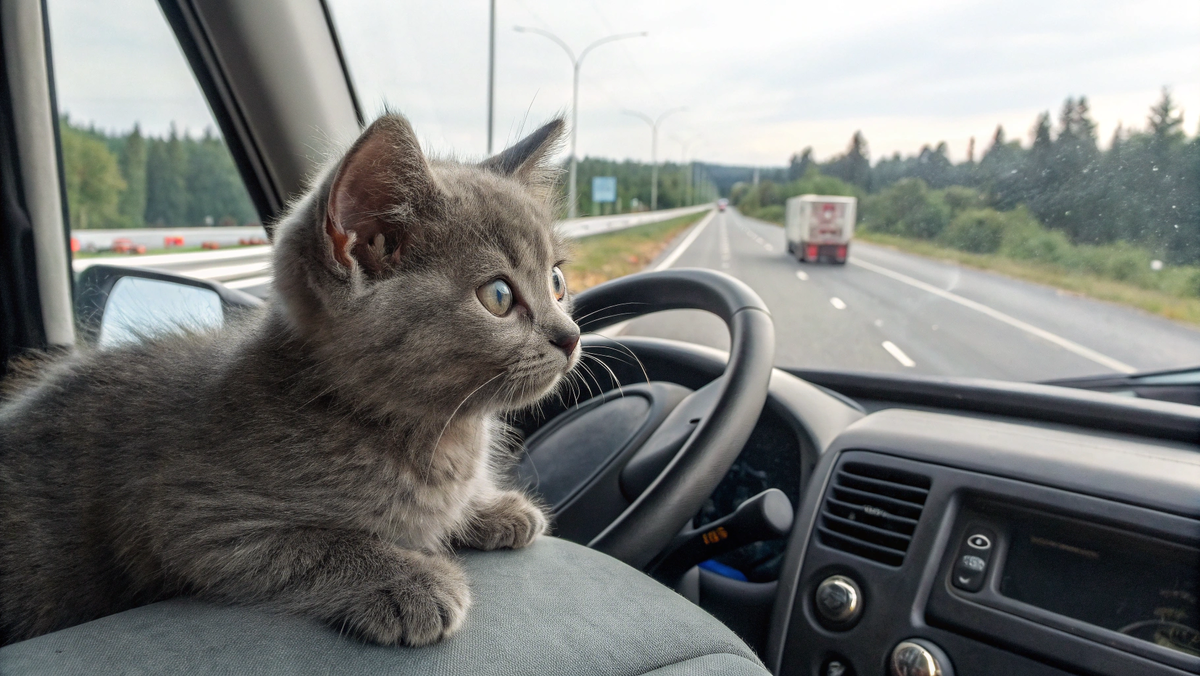 Котенок будто понимал. Сидел спокойно, наблюдал за дорогой. Иногда мяукал — будто комментировал происходящее.