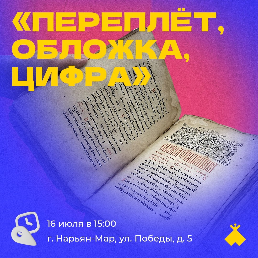 ✨ Завтра в музее пройдет интерактивное занятие «Переплёт, обложка, цифра» Убедитесь, что книги – это не скучно. Познакомитесь с древней книгой в старинном ПЕРЕПЛЁТЕ, современной книгой в красивой ОБЛОЖКЕ и электронной книгой – «ЦИФРОЙ». А в завершении занятия изготовите собственную уникальную закладку для книг. 📍16 июля в 15:00 📍Ненецкий краеведческий музей (г. Нарьян-Мар, ул. Победы, д. 5) 📍7-14 лет 💸50 рублей 🥰 Не забудьте подписаться на канал