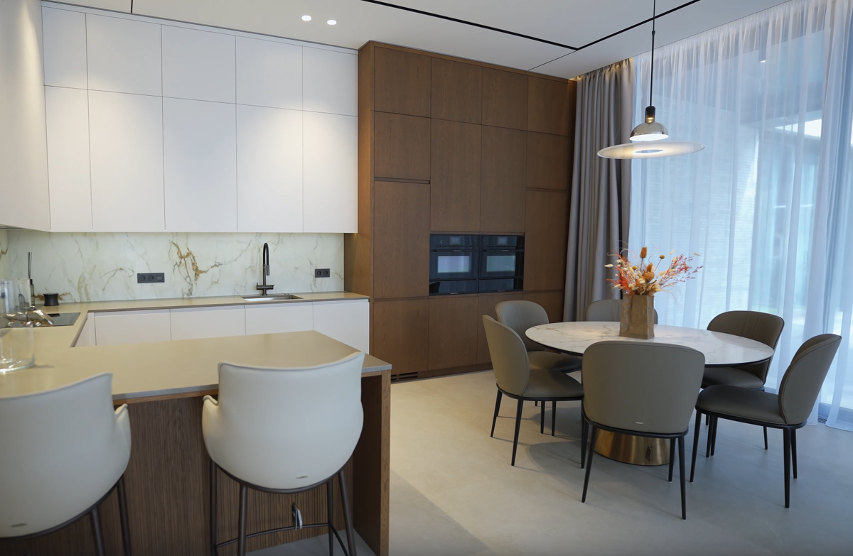 Его основа - натуральные материалы. Шпон дуба используется в мебели и отделке стен, кварц с подсветкой - в отделке колонн и на столешнице. А комод из обожженного дерева своей брутальностью только подчеркивает элегантность интерьера. Весь дом в горшках с живыми цветами - минимализм же природный. Да, фасад в серой гамме, но цвет - теплый и отлично сочетается с дизайном интерьера. Статуя на входе из литой бронзы, с благородной патиной приглушенного природного оттенка. Второй арт-объект в том же стиле - в холле второго этажа. Теплые полы и теплые одеяла - в комплекте!
