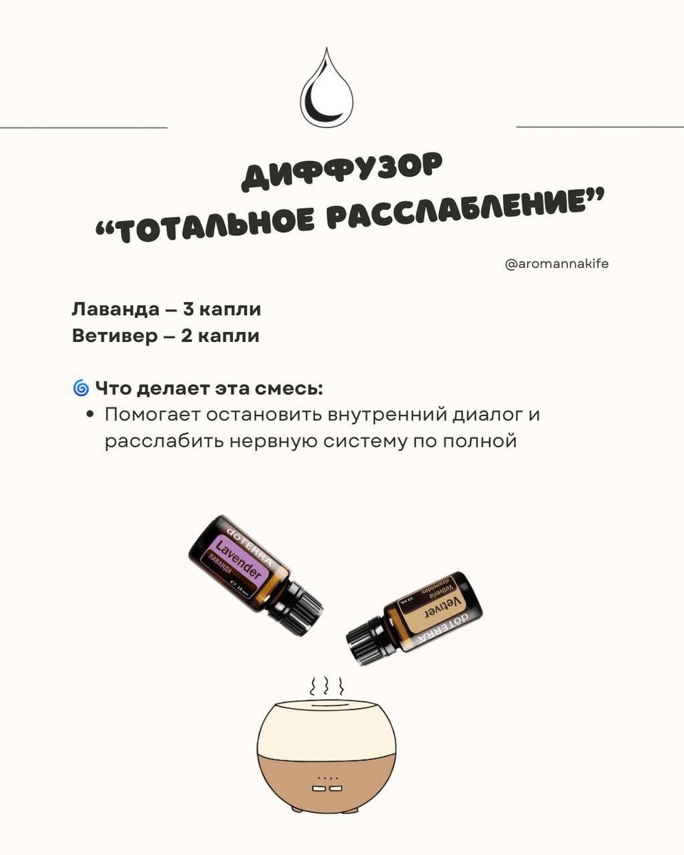 Выспись уже наконец! Смесь в диффузор: 😘 “Тотальное расслабление” • Лаванда — 3 капли • Ветивер — 2 капли → Помогает остановить мысленный поток, усыпляет не тело, а внутренний диалог 😘Практика: В постели — нанеси роллер на грудь, положи руки на диафрагму. Сделай 5 вдохов - дышим животом. Представь, что выдыхаешь всё напряжение через пятки. Лайфхак: 📌Капни на ватный диск смесь лаванды и ветивера, положи рядом с подушкой — если нет диффузора. Работает не хуже!