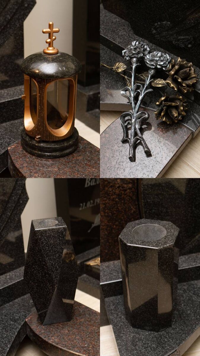 Основные виды аксессуаров: Вазы для цветов — классический элемент для размещения живых или искусственных цветов. Изготавливаются из гранита, мрамора или металла. Лампады — символизируют вечный свет памяти, бывают металлическими или каменными. Цветники — организуют пространство для цветов, выполняются из гранита или тротуарной плитки. Тротуарная плитка — облагораживает территорию вокруг памятника. Кованые элементы — добавляют индивидуальности, могут быть в виде фигурок или декоративных вставок. Критерии выбора: Материал — выбирайте долговечные материалы: гранит, мрамор или металл с защитным покрытием. Стиль и дизайн — аксессуары должны гармонировать с основным памятником. Функциональность — учитывайте, как будете использовать каждый элемент. Размер — пропорции должны соответствовать размеру участка. Рекомендации по сочетанию: Единый стиль — если памятник классический, выбирайте лаконичные аксессуары. Цветовая гамма — цвет элементов должен сочетаться с памятником и оградой. Символика — у