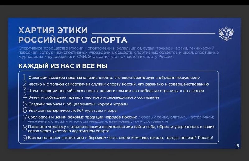 Коллегия Минспорта большинством голосов приняла хартию этики российского спорта Документ носит рекомендательный характер и добровольно принимается спортивным сообществом России. Полный список пунктов из хартии: https://bg.ru/bg/business/comm-news/28336-minsport-doc ❤ «Большой Город»