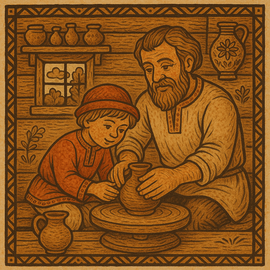 В тёплой деревенской избе тихим вечером бабушка усадила двух маленьких внучат у русской печи. Огонь в печке потрескивал, отбрасывая мягкий свет на стены, и аромат травяного чая наполнял горницу. Ребятишки слушали, затаив дыхание, а бабушка, прищурив ласковые глаза, начала свою сказку. На тёплой печной лежанке мурлыкала полосатая кошка. Она говорила неспешно, будто песню напевала. Жил-был в той деревне мастеровой гончар по имени Карп. С самого утра он крутил гончарный круг у окошка, лепил из мягкой глины горшки, крынки да миски. Каждый свой горшочек Карп обжигал в печи и расписывал узорами, вкладывая душу в дело рук. Рос у гончара сын Петя — мальчик добрый, да вот только к отцовскому труду пока неохотливый. По всей избе на полках стояли ряды расписных горшков его работы — любо-дорого поглядеть. Вместо того чтобы помогать отцу, Петя частенько убегал играть на луг и в лесок за околицей. Там он ловил рыбок в ручье, мастерил свистульки из веточек и собирал лесные ягоды. Однажды Петя услыха