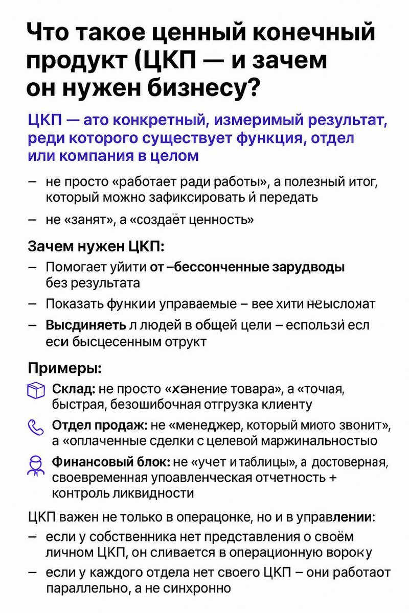 Что такое ЦКП (конечный продукт функции) — и зачем он нужен в управлении? В малом бизнесе часто звучит фраза: «Он у нас за всё отвечает». Но если копнуть — непонятно, за что именно и какой результат должен быть на выходе. Вот тут и нужен ЦКП — конечный продукт функции. Это конкретный, измеримый результат, за который отвечает функция или сотрудник. Без него — вы не управляете, а просто «надеетесь на ответственность». Примеры ЦКП для разных функций: ▪️ Продажи: ЦКП — оплаченные заказы от целевых клиентов по плану выручки. Не «звонки», не «встречи», а деньги в кассе. ▪️ Маркетинг: ЦКП — квалифицированные лиды по нужной цене. Не «охваты», не «посты в соцсетях», а лиды, которые потом конвертируются в клиентов. ▪️ Производство / поставки: ЦКП — готовый продукт или услуга, выполненные по сроку и стандарту. Не «мы почти сделали», а выполнено в нужный день без переделок. ▪️ Бухгалтерия: ЦКП — сданная отчетность без штрафов и актуальные данные в учете. Не «мы ведем бухучет», а все закрыто, про