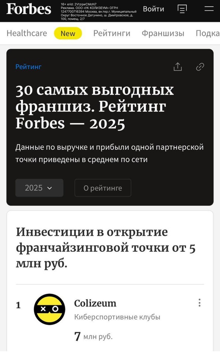 COLIZEUM — самая выгодная франшиза в России в 2025 году по версии Forbes