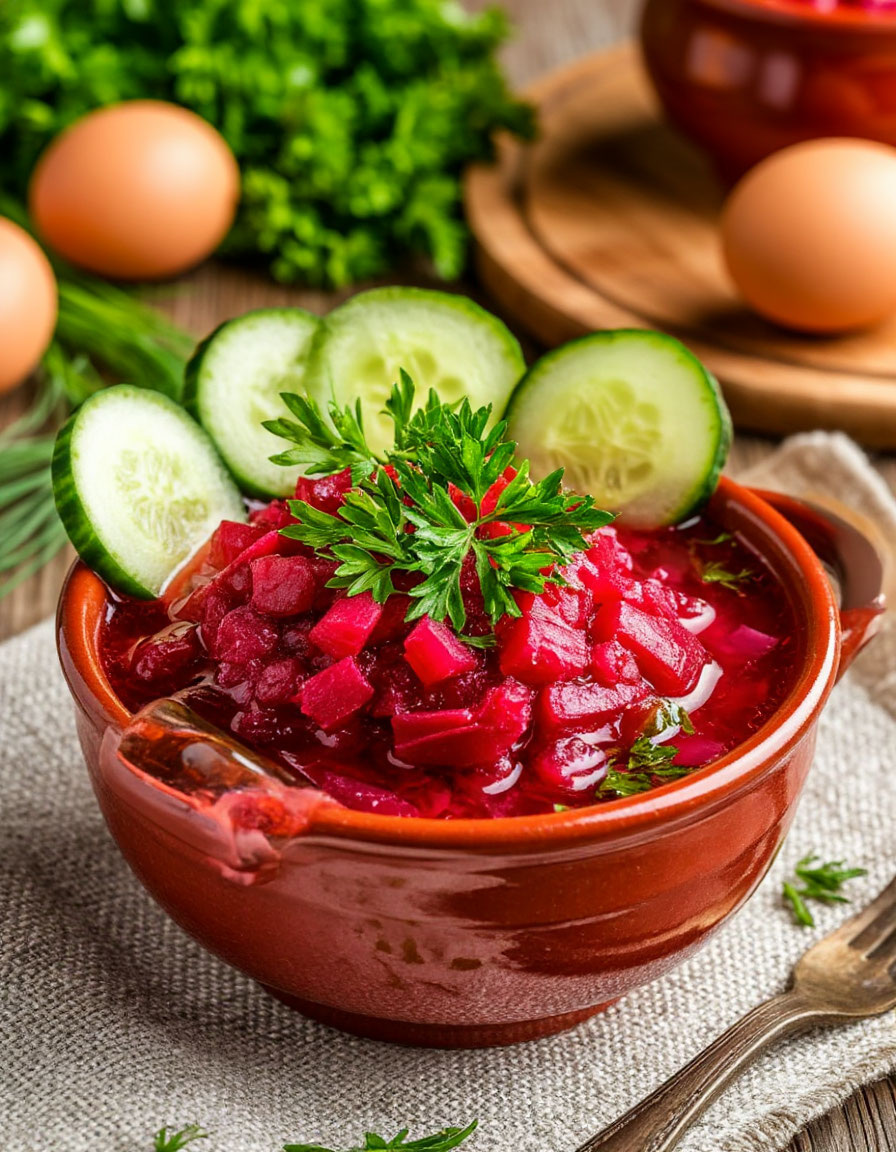 Литовский холодный борщ — это освежающий и питательный суп, популярный в Литве и других странах Балтики. Он идеально подходит для жарких летних дней, благодаря своему охлаждающему эффекту и яркому вкусу. Свеклу отварите до мягкости, остудите и натрите на крупной терке или мелко нарежьте. В большую миску выложите свеклу, добавьте кефир или йогурт, при необходимости разбавьте водой до желаемой консистенции. Нарежьте свежие огурцы мелкими кубиками или тонкими ломтиками. Добавьте нарезанный зеленый лук, петрушку и укроп. Посолите, поперчите по вкусу, добавьте лимонный сок или уксус для кислинки. Тщательно перемешайте и охладите в холодильнике минимум на 1 час перед подачей. Перед подачей украсьте нарезанными вареными яйцами. Подача: Подавайте холодным в глубоких тарелках или мисках, украшая свежей зеленью и кусочками яйца. Можно дополнительно добавить сметану или немного оливкового масла. Этот борщ обладает легким вкусом, насыщенным природной сладостью свеклы и свежестью зелени. Он отличн