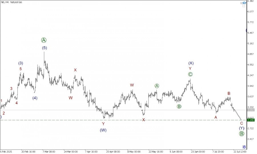 https://basechop.ru/wordpress/?p=50619 Глядя на текущий график, можно заметить, что по Газу может формироваться крупный коррекционный тренд. На текущем графике представлена разметка большой действующей волны (Y), принимающей форму тройного зигзага W-X-Y-XX-Z. На текущем графике мы видим, что действующая волна Z похожа на стандартный зигзаг, внутри которого завершен импульс [A]. Сейчас может формироваться коррекционная подволна [B], которая, судя по всему, принимает форму двойного зигзага (W)-(X)-(Y). Предполагается, что на сегодняшний день завершена только первая действующая волан (W), она приняла форму двойного зигзага W-X-Y. Сейчас в процессе развития может находиться противодействующая волна связка (X), она тоже представляет собой двойной зигзаг W-X-Y. На последнем участке графика может формироваться финальная зигзагообразная волна Y. Внутри волны Y могла подойти к концу коррекционная подволна [B]. Но в приоритете вариант в котором ее развитие продолжается. Есть большая вероятность,