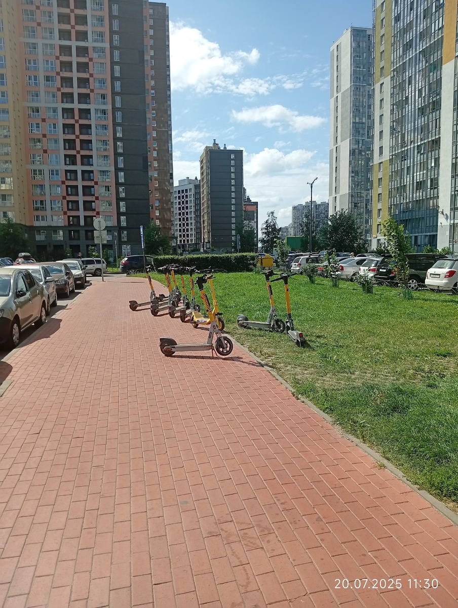 3) Самокаты также разбросаны где попало, по тротуарам, где хотел там и бросил.