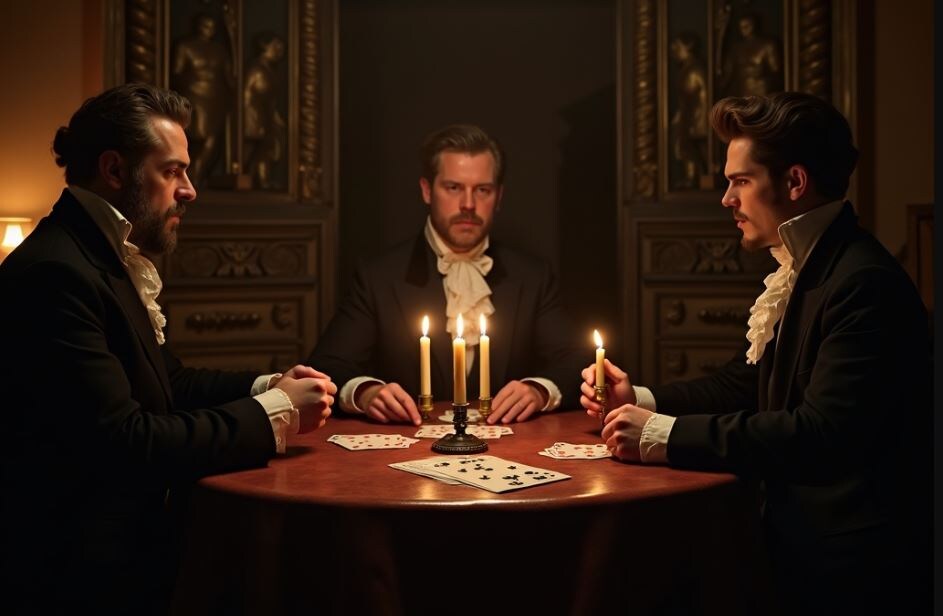 Карта Георгия оказалась старше. Он сгрёб золото, чувствуя знакомое опьянение. Вот она — настоящая жизнь! Не скучные хозяйственные отчёты, а азарт, риск, борьба с судьбой!