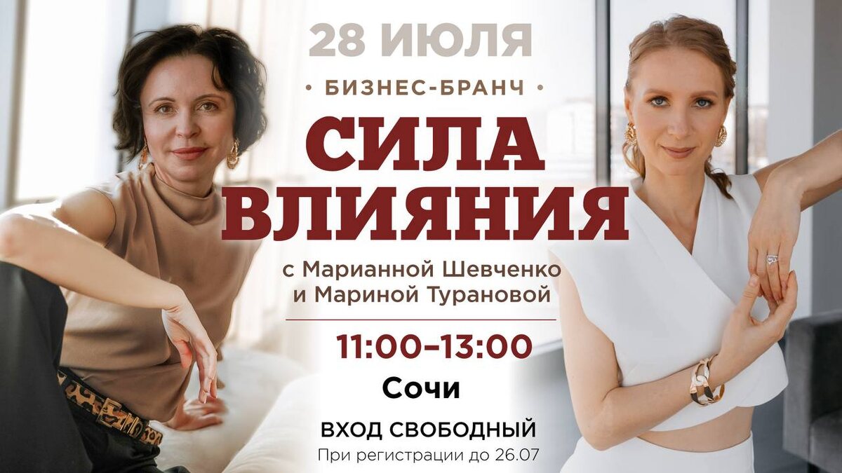 🤩ОФЛАЙН-ВСТРЕЧА В СОЧИ! Вот это новости! 😱 Заканчивая поток NewStart Profi, участники летят из-за границы на выпускной в Сочи. И мы решили провести эксклюзивную открытую встречу для вас со мной (потому что офлайн уже эксклюзив) и с Марианной (потому что в Швецию к ней прилететь вам сложнее) 😁 Что будет? ☕️ Бизнес-бранч “Сила влияния” 🗓28 июля 🕚 11:00–13:00 📍 Вкусный ресторан Сочи😋 💰 Вход свободный При регистрации до 26.07 🎓Тема бранча: Как держать фрейм, управлять вниманием и усиливать влияние — без давления и оправданий 🔹 ЧАСТЬ 1 Коммуникативный тренинг от Марианны Шевченко «Говори, чтобы влиять» 💬 Как вести себя, когда все смотрят на вас и ждут вашей реакции? 💬 Как отвечать на вбросы и провокации, не изменяя себе и не скатываясь в оправдания? 💬 Как говорить, чтобы вас не просто слушали, а следовали за вами? 🎓Марианна Шевченко — эксперт по международному влиянию, публичный дипломат, руководитель гуманитарных и культурных инициатив в 20 странах мира. 🔸 ЧАСТЬ