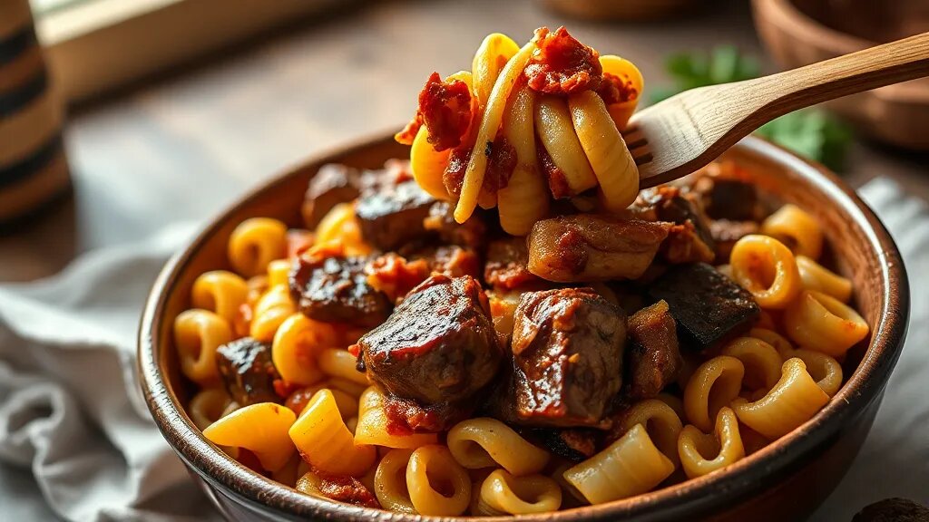 Макароны: Упругие, идеально сваренные «аль денте». Они не просто фон – они пропитаны всем этим великолепием: соком мяса, карамелью лука, маслом. Каждый укус – гармония текстур и вкусов.