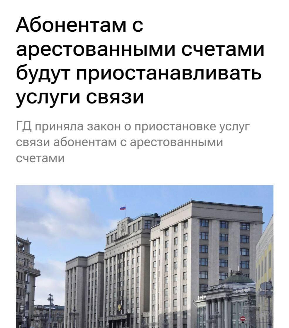 🚫 С 1 сентября россиянам с арестованными счетами начнут отключать связь Если у гражданина арестован счёт — оператор может заблокировать доступ к сотовой связи. Такая мера предусмотрена новым законом, который приняла Госдума. Отключение коснётся не только тех, чьи счета уже под арестом. Связь могут ограничить и тем, кто проводит подозрительные переводы (об этом писали тут). Дата вступления в силу — 1 сентября. 🔥 Без ДЕНЕГ и без СВЯЗИ. Но и это еще не все: перед каникулами депутаты успели ввести новые запреты и штрафы Сегодня Госдума приняла сразу несколько законов, ужесточающих контроль внутри страны. Все они уже утверждены и вступят в силу в ближайшее время. ▪️ Штраф до 5 000 ₽ — за сам факт поиска экстремистских материалов в интернете. ▪️ Штраф до 50 000 ₽ — за передачу аккаунтов и SIM-карт третьим лицам. ▪️ Штраф до 500 000 ₽ — за распространение рекламы VPN-сервисов. Также принят закон, запрещающий фильмы, дискредитирующие традиционные ценности. Это ограничит список разреш