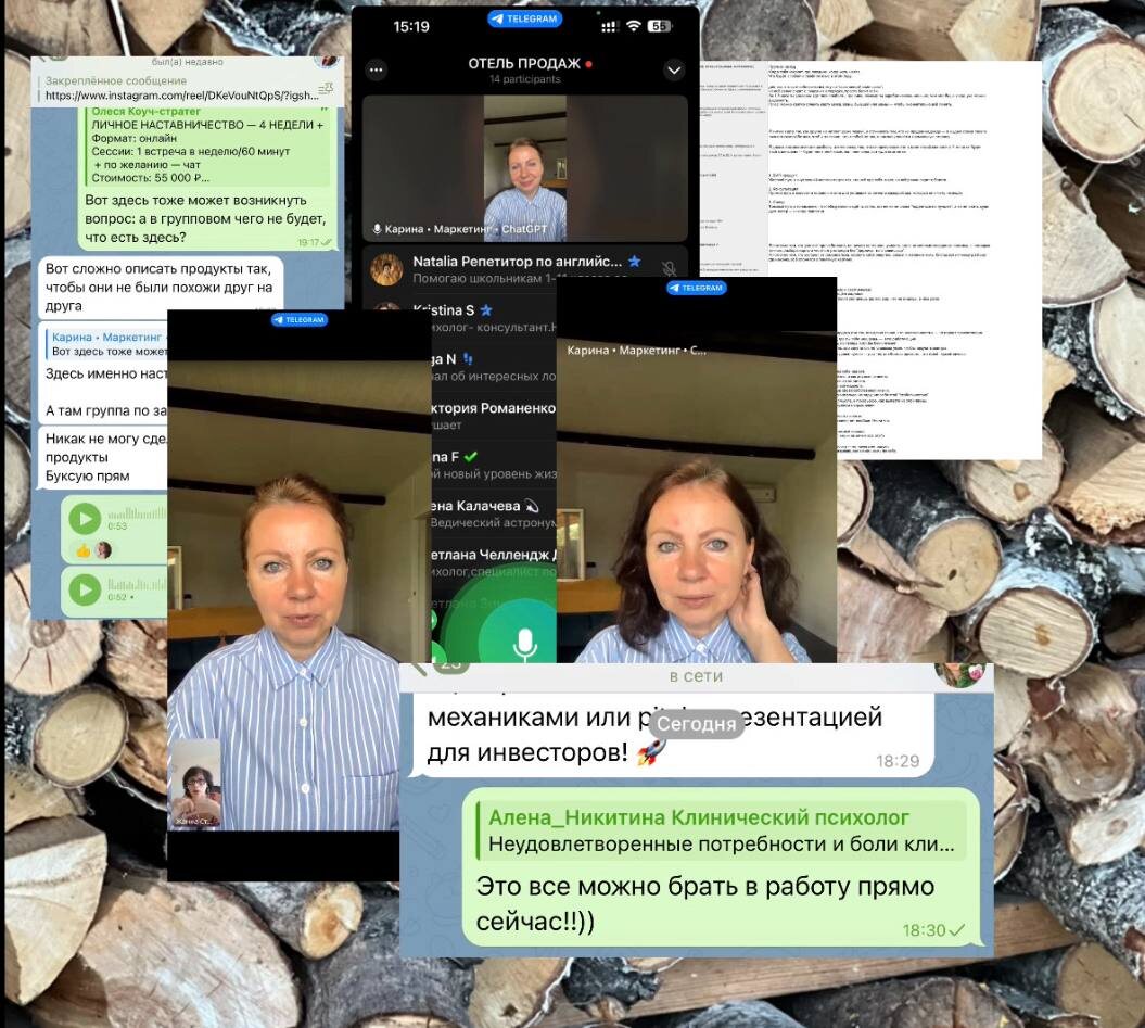 Мария, астролог. Личная работа. Прописала 20 вариантов УТП. Олеся, бизнес коуч. Практика 4.0. Дала рекомендации по продуктовой линейке и ценам на услуги. Алёна, психолог. Практика 5.0. Проанализировали тренды. И получили таааакие идеи для продукта, что я просто выпала в осадок. Когда Алёна это реализует, ей не будет равных! Жанна, МАК терапевт, расстановщик, коуч. Консультация. Рекомендации по ведению блога. Елена, нумеролог, астролог. Практика 4.0. Практика продаж на консультациях. Игра Отель продаж. Заключительный эфир. Поделилась опытом: - Как набирать подписчиков - Как писать - Как продавать