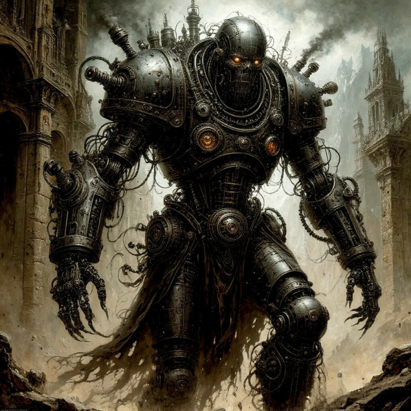 Тяжелые чугунные петли лопнули, и двери храма обрушились вовнутрь. При свете окружавших алтарь свечей люди увидели, как внутрь святилища Анахты запрыгнуло человекоподобное существо, целиком облаченное в сверкающую сталь. Оно завидело Галь-Рикки и издало низкий утробный рёв, подобный звериному, только гораздо страшнее. Ноги железного демона пружинисто согнулись, готовые бросить создание в атакующий прыжок.