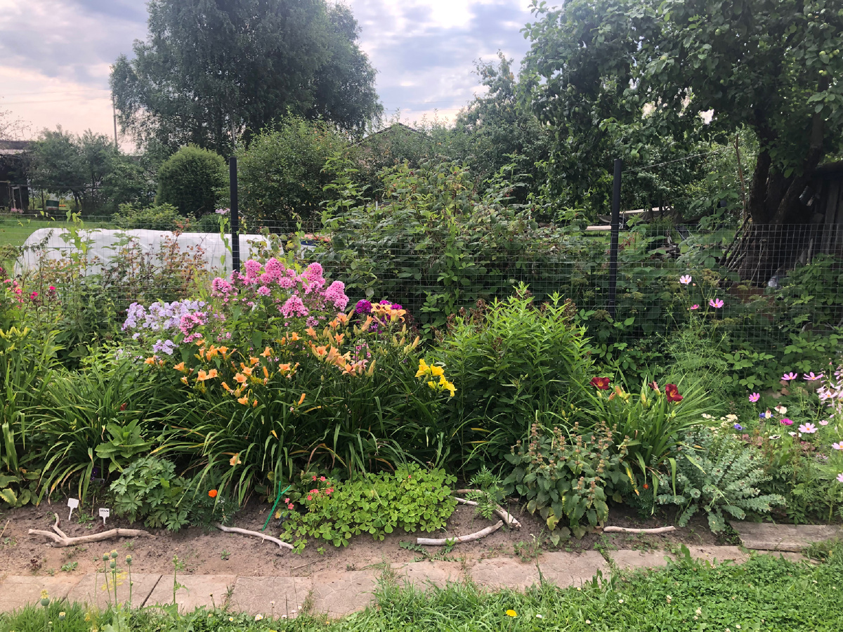 Июль-месяц, когда цветут лилейники и флоксы.Сортов у меня не очень много, и собраны почти в одном месте.Вот так выглядит издалека: Вот так снимала под другим углом.Не знаю, как делать фото, что бы поместилось все: Теперь детально.Лилейники.Не знаю названий ни одного сорта из тех, что цветут сейчас.Делились посадочным материалом знакомые и соседи. Здесь на заднем плане ещё и флокс попал. Флоксы, ещё не все начали цвести.Сортов тоже не знаю, покупались у бабушек на рынке.Знаю только один Бисер: Остальные не опознанные: На краю этой клумбы есть теневой кусочек, там живут мини хосты.Стилетто, купила в прошлом году: Мышка цветет: И ещё одна, не знаю кто,сидит за космеями. И, да у меня совсем все не идеально.Банально не справляюсь.Вот космею вовремя не выдернула.Она зацвела, вроде жалко.Но ведь совсем не к месту. Вот ещё кусочек клумбы с анемонами и пара г-ер попала в кадр.Это те,что семенами выращены. С другого краю, веселенькие виолы.Каждый год самосевом растут: Недавно мне в коммента