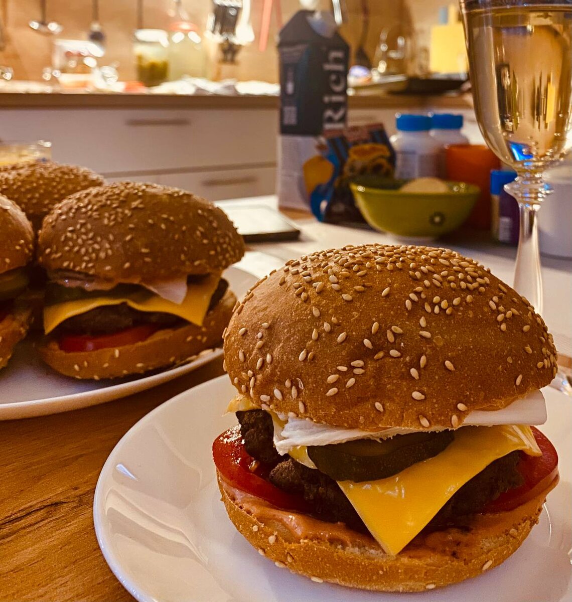 начинки конечно могут быть разные 🍔 мой фаворит: 🥓котлеты чисто из фарша с перцем и солью 🥒огурцы соленые 🍅томаты 🧀сыр 🌶️маринованный в уксусе со специями красный лук (мариную и оставляю в холодильнике на пару минут) соус: майонез кетчуп горчица и соленые огурчики через мелкую терку соуса побольше и на две половинки булочек 🥯булочки поджарить на сухой сковородке, чтобы они потом не размякли котлеты жарить не придавливая 🧈 весь сок остается так внутри на один бургер в среднем котлета из 100гр фарша вот и всё аромаааат по всей кухне