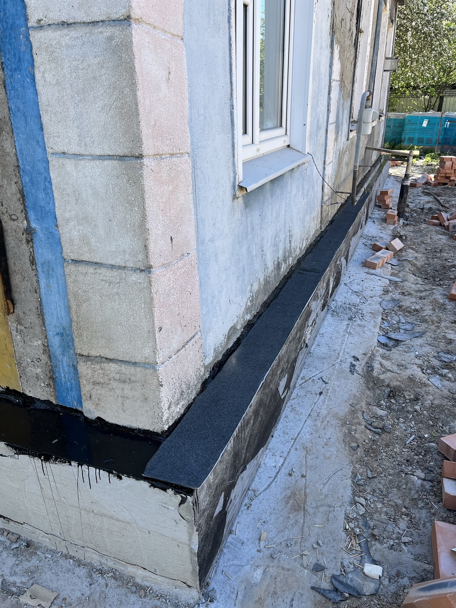 Опалубку сняли. Теперь нужно подготовить основание для облицовочного кирпича. Поверх фундамента нанесли гидроизоляционный слой - битумную мастику (размазывала все сама 😀). Сверху положили рулонную гидроизоляцию - стеклоизол. Основанием для облицовочного кирпича у нас служит полнотелый кирпич М200. За счет раствора удалось убрать перепады уровня фундамента, хоть они и были небольшими. По новому плану вход в дом должен быть расположен с другой стороны относительно старого. Так как стен у пристройки еще не было, временный вход в старую часть дома появился на месте окна, где впоследствии будет вход в гостиную. Чтобы сделать проем, необходимо было срезать радиаторы и трубы отопления, которые были под окном. Так как погода позволяла (была уже вторая половина мая и холодов не предвиделось), мы отключили отопление, и рабочие сделали новый вход в дом. Дверь временно поставили старую. Старый дверной проем заложили тем же полнотелым кирпичом. Закончив основание, рабочие стали примерять облицовоч