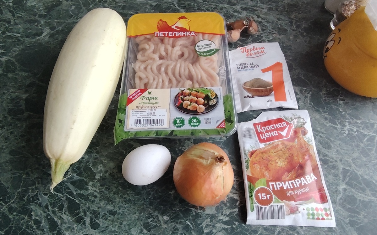 Здравствуйте, мои дорогие подписчики и гости. Сезон кабачков объявляю открытым. Жарили их на даче и три штуки привезли в город. Решила приготовить куриные котлеты с кабачком вместо булки. Летний облегченный вариант. В фарш добавила яйцо, соль, специи. Почистила овощи. Натерла половину кабачка. Получилось 260 граммов. Порезала лук помельче. Можно его потереть. Выдавила чеснок. Он прошлогодний, уже не жгучий. Забыла свежий привезти с дачи. Перемешала фарш. Он получается жидковатым. Руками котлетки не сформировать. Выкладываю котлеты ложкой на разогретую смазанную сковороду. Когда пошёл аромат котлет, переворачиваю их. Накрываю крышкой минут на десять. Первая партия готова. Выкладываю вторую партию. Наслаждаюсь вкусным ужином. Огурчики домашние. Муж сказал, что вкусные котлеты. Если бы не знал про кабачок, то сам не догадался. Мне тоже понравились куриные котлеты с кабачком. Буду ещё их готовить. В следующий раз лук предварительно обжарю перед добавлением в фарш. Кто люби