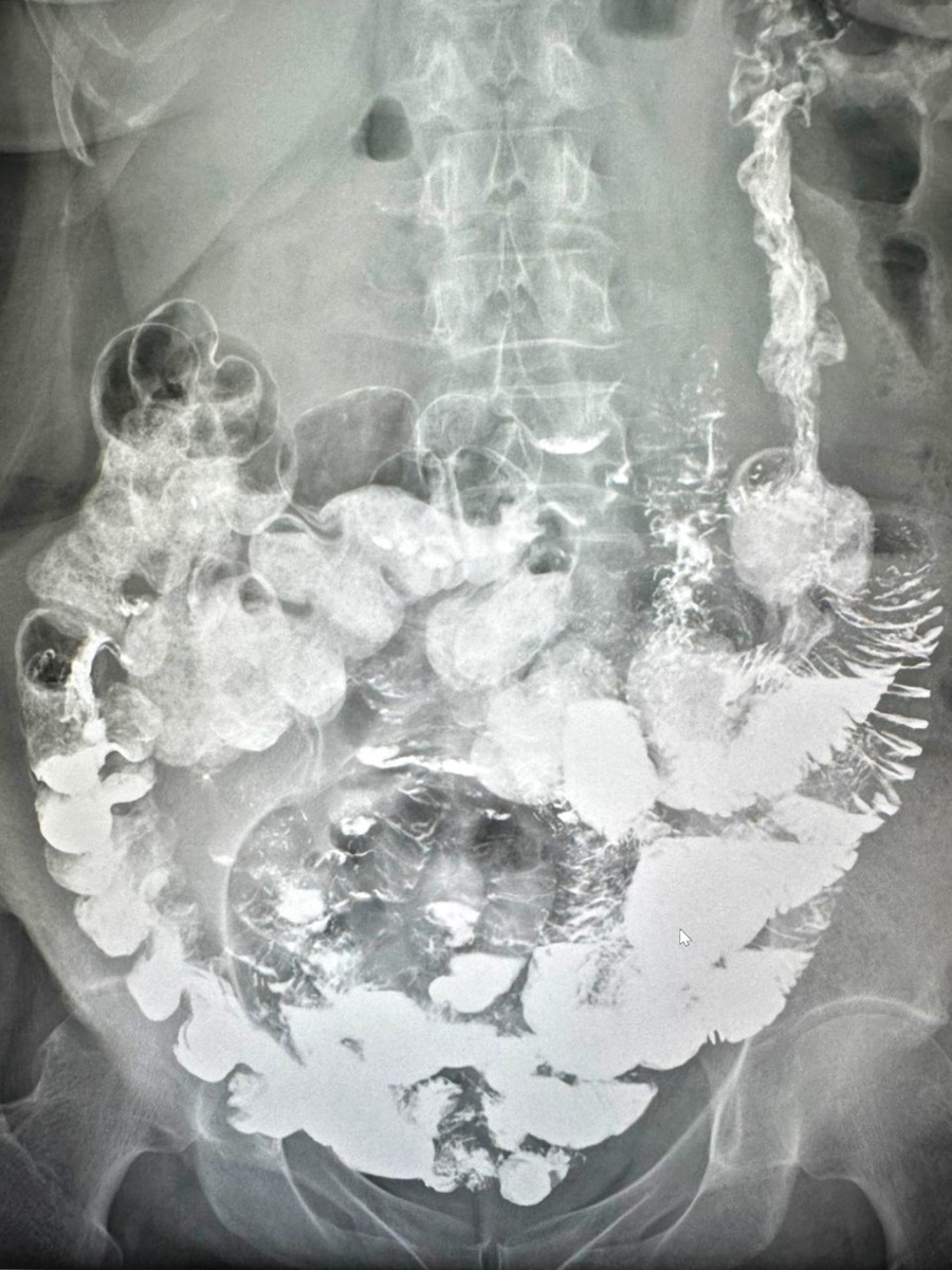 В Ильинскую больницу обратилась пациентка П., 63 лет, с жалобами на дискомфорт и вздутие в левых отделах живота, а также запоры до 7 дней без терапии. Пациентка отметила, что регулярный прием слабительных препаратов («Гутталакс») вызывал жидкий стул 1 раз в 3 дня. Анамнез заболевания указывал на наличие запоров с детского возраста, что сопровождалось частыми обращениями к гастроэнтерологам с диагнозом «синдром раздраженного кишечника». Пациентка принимала урсодезоксихолевую кислоту (УДХК), слабительные и спазмолитики без значительного улучшения. При первичном осмотре гастроэнтеролог А.А.Атаева тщательно собрала анамнез и изучила предоставленную медицинскую документацию. Для уточнения диагноза и определения дальнейшей тактики лечения врач рекомендовала дополнительное обследование, которое ранее пациентке не проводили - рентгенологическое исследование с пассажем бария. По результатам рентгенологическое исследование пассажа бария по ЖКТ выявлены признаки синдрома Пайра (высокая фиксация с