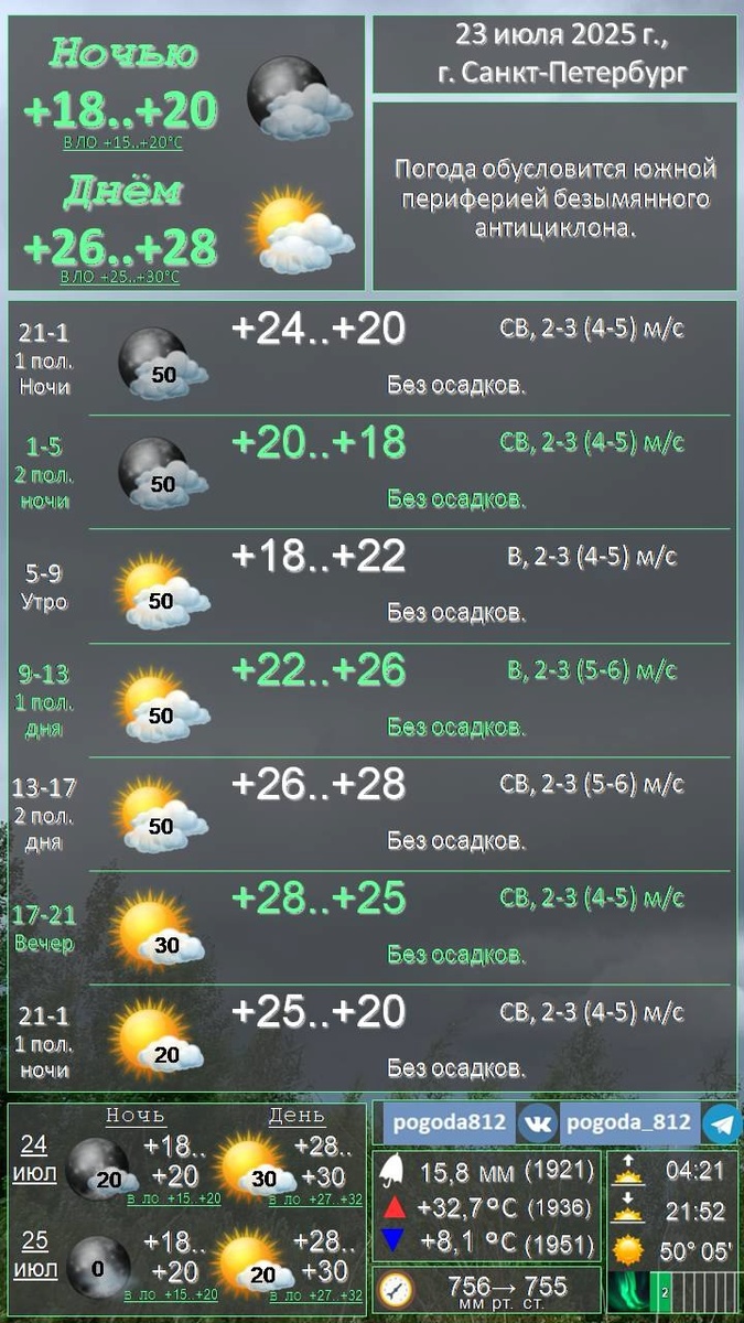 #прогноз@pogoda812 НОВАЯ ВОЛНА ЖАРЫ Завтра в Санкт-Петербурге ночью ожидается приблизительно +18°С..+20°С, переменная облачность и без осадков. Днём облаков будет примерно столько же, а к вечеру они разойдутся и станет малооблачно. Температура достигнет +28°С (местами до +29°С..+30°С), ветер прогнозируется слабый, а осадков не будет. На следующий день, в четверг, 24 июля, начнётся новая волна жары. Ночью температура по-прежнему ожидается около +18°С..+20°С, но днём воздух прогреется до +30°С или +31°С в городе и до +32°С в области. На протяжении суток будет малооблачно и без осадков. В пятницу, 25 июля, жара останется прежней, то есть температура днём будет достигать +30°С или даже +31°С. При этом по-прежнему весь день будет малооблачно и без осадков. После этого жара немного спадёт, то есть температура днём будет достигать +28°С, и такая погода продлится ещё до следующей недели, после чего, возможно, у нас будет похолодание.
