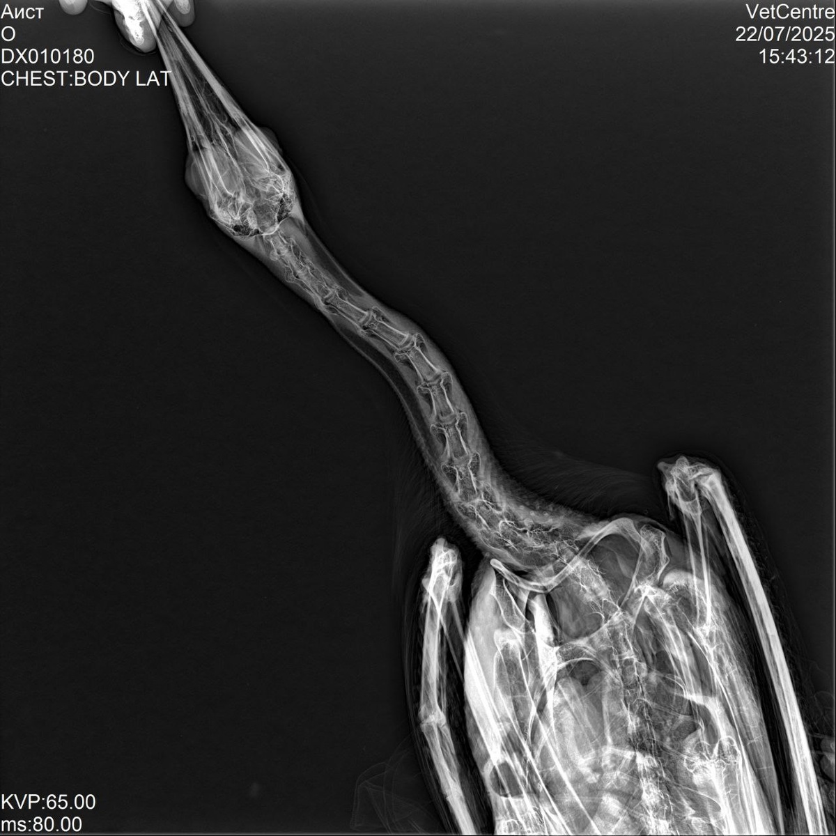 Рентген Аистенка Иваныча, травм нет, в остальном по состоянию завтра должно быть все понятно, если наши подозрения подтвердятся, то завтра он должен будет голову держать, держим за наши надежды кулачки! Дело в том, что сегодня после утреннего кормления, он срыгнул чернозеленую субстанцию вместе со съеденной рыбой, мы решили больше его не кормить и повезли к врачу, вчерашняя и сегодняшняя порция чиктоника смазала видно застрявшую гадость в пищеводе, эта гадость начала разлагаться и вызвала инфекцию. Если это так, то обильное кормление, ударная доза витаминных добавок и он еще в Африку слетает! Быть Добру!