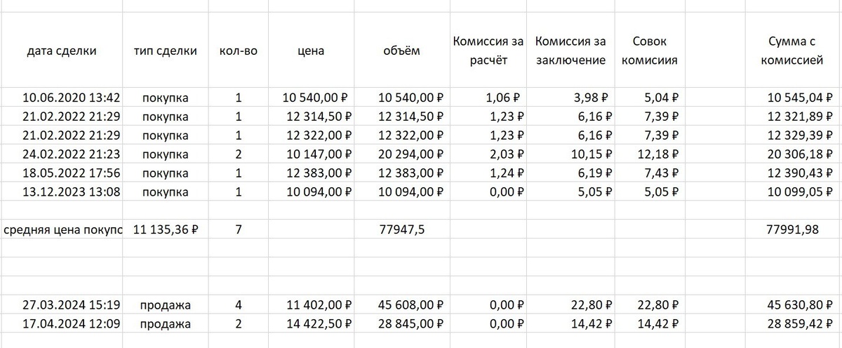 Купили 7 бумаг компании Полюса в разные временные периоды, и 6 бумаг продали в этом году.