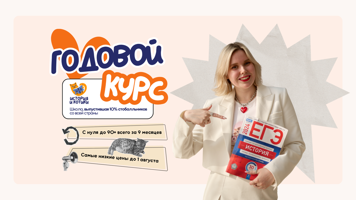 Это мощная программа, в которой ты целых 4 раза разберешь всю историю России, всемирную историю, научишься решать любые задания, включая культуру, карты и сложные вопросы второй части. 🔍 Сентябрь — ускоренный разбор всей теории от Рюрика до Путина. Уже через месяц ты будешь писать пробники на 50-60 баллов!