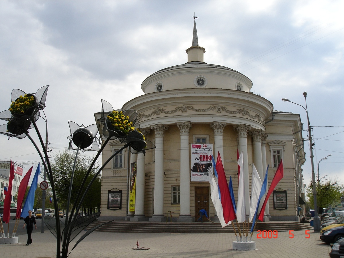 Элегантный фасад Орловского драматического театра привлекает внимание своей изящностью и гармонией с окружающей архитектурой. Здание построено в стиле классического академизма, что подчеркивает его значимость как культурного центра. Белоснежные колонны, украшающие портал, создают ощущение величественности и стабильности. Круглый купол венчает центральную часть здания, добавляя изысканный штрих к общему облику и прекрасно сочетается с окружающими историческими постройками. Несмотря на изменения в городской инфраструктуре, фасад театра остался неизменным и служит символом устойчивости традиций и культурной преемственности.