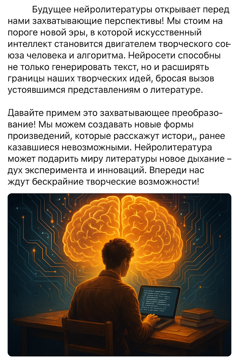 В мире, где технологии становятся продолжением наших мыслей, нейролитература рождается как новый способ общения — не только через слова, но через эмоции, образы и сны. Это не просто искусственный интеллект, создающий тексты. Это симбиоз разума и машин, где границы авторства размываются, и каждый может стать соавтором мира, рождённого на стыке воображения и алгоритма. Нейролитература уже сегодня предлагает нам заглянуть в будущее, где история создаётся не по шаблону, а как поток сознания, подстраивающийся под читателя. Это литература, способная чувствовать, менять форму и смысл — оживающая на экране и в душе. Мы стоим у порога новой эпохи искусства, где слово не просто читается, а переживается.