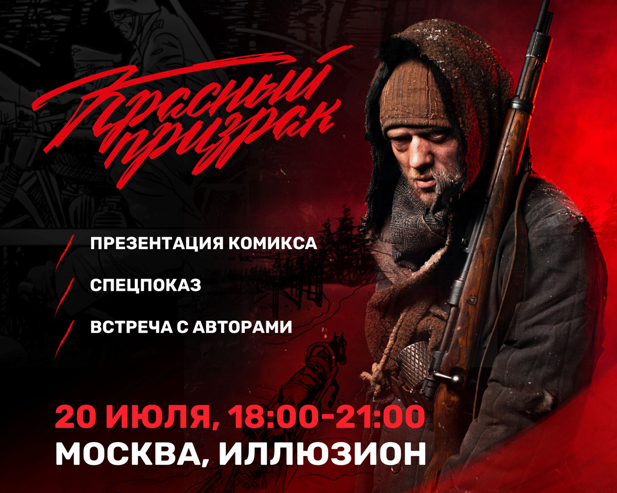20 июля в 18:00 в московском кинотеатре «Иллюзион» состоится спецпоказ фильма «Красный призрак», приуроченный к выходу одноименного комикса издательства Alpaca. Графический роман является вольным продолжением картины, развивающий тему нового главного героя – немого мстителя Константина. Гостей вечера ждет показ фильма, презентация графического романа, а также встреча с режиссером Андреем Богатыревым, актерами Константином Симоновым и Славой Шихалеевым, сценаристом Дмитрием Чиновым и художником Ильей Ворониным. Действие ленты разворачивается зимой 1941 года. В немецких тылах ходят слухи о неуловимом советском солдате, который возникает словно из воздуха и в одиночку расправляется с фашистами. Партизана нельзя пленить или застрелить. Немцы прозвали его Красный призрак, и бросили на поиски отряд карателей. В продаже доступно 2 вида билетов: - стандартный (300 рублей) – просмотр фильма и встреча с авторами; - лимитированный (800 рублей) – в дополнение идет экземпляр комикса с эксклюзивной